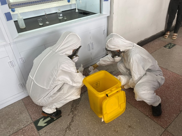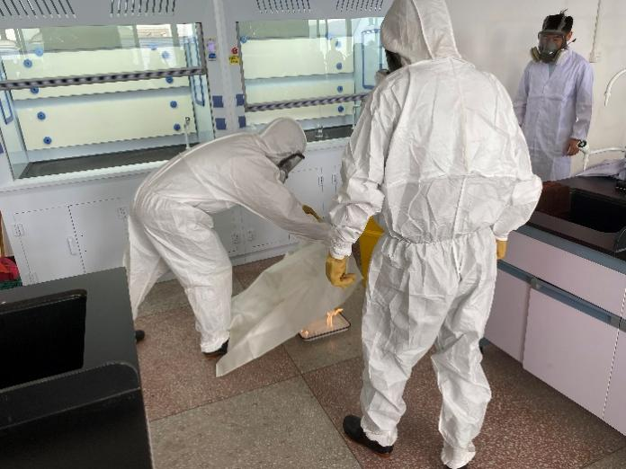 演练开始,一位实验人员在拿取乙醚试剂时,不小心将试剂瓶摔碎,乙醚迅速泄漏,并在短时间内引发了火灾。实验室顿时“火光四起”,危机四伏。面对突如其来的“险情”,实验室立即启动应急预案,各应急小组迅速行动,疏散组、抢险组、医护组和舆情组各司其职,协同配合,灭火、抢险、救援、疏散等应急措施紧张有序地展开。