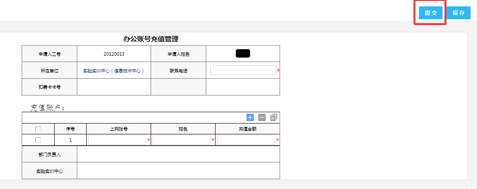 3. 填写充费申请信息并提交部门领导审核(带红色星号的都为必填项)